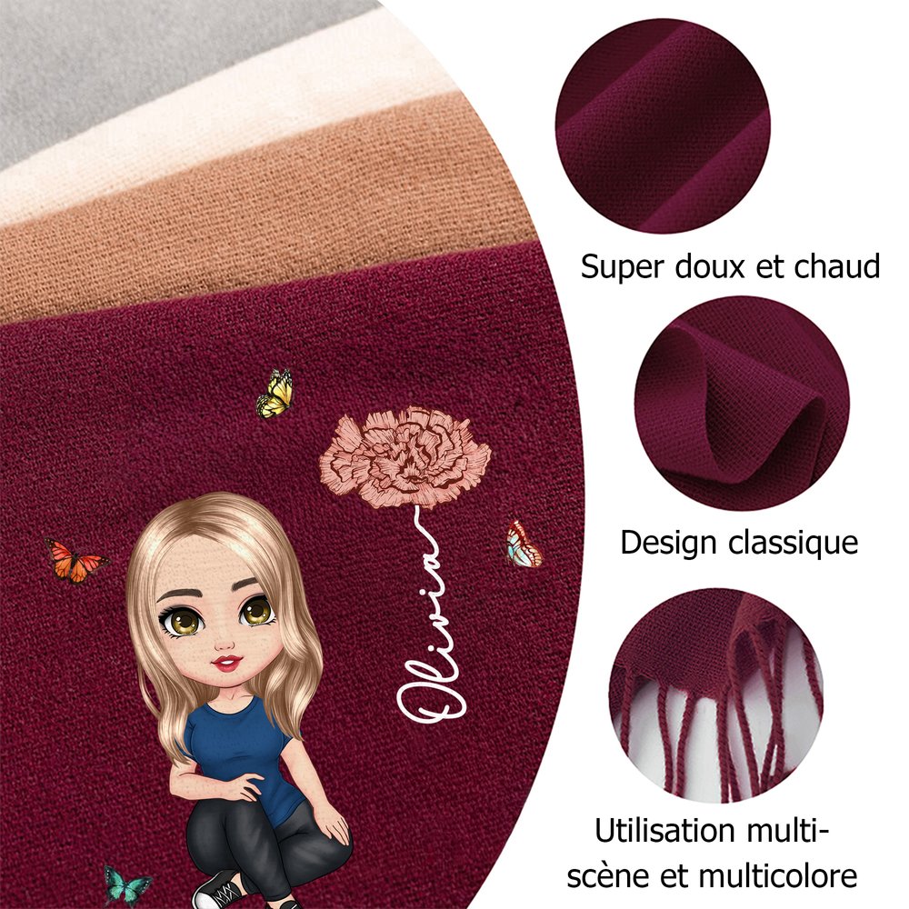Notre écharpe est ornée de joyeux personnages de dessins animés et de fleurs d'anniversaire, ce qui la rend encore plus amusante et attrayante. Vous pouvez personnaliser le personnage de dessin animé et la fleur d'anniversaire en ajoutant votre nom pour donner à l'écharpe une identité unique. Chaque pièce est ainsi unique, ce qui permet à votre style personnel de s'exprimer.